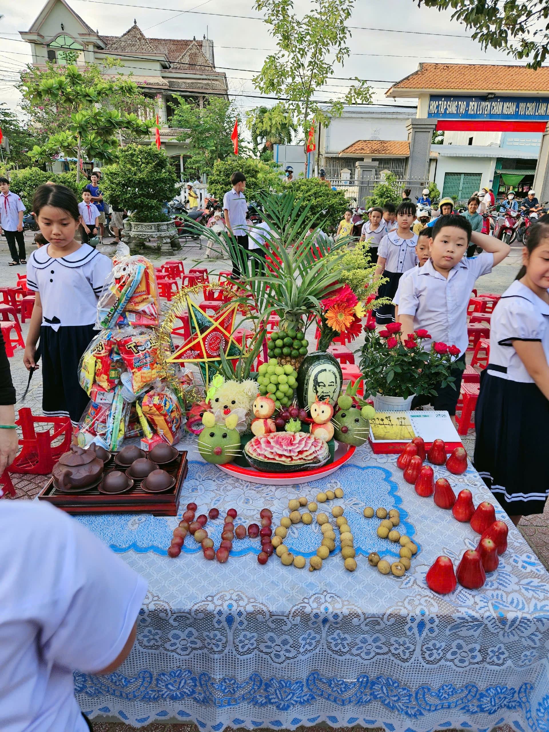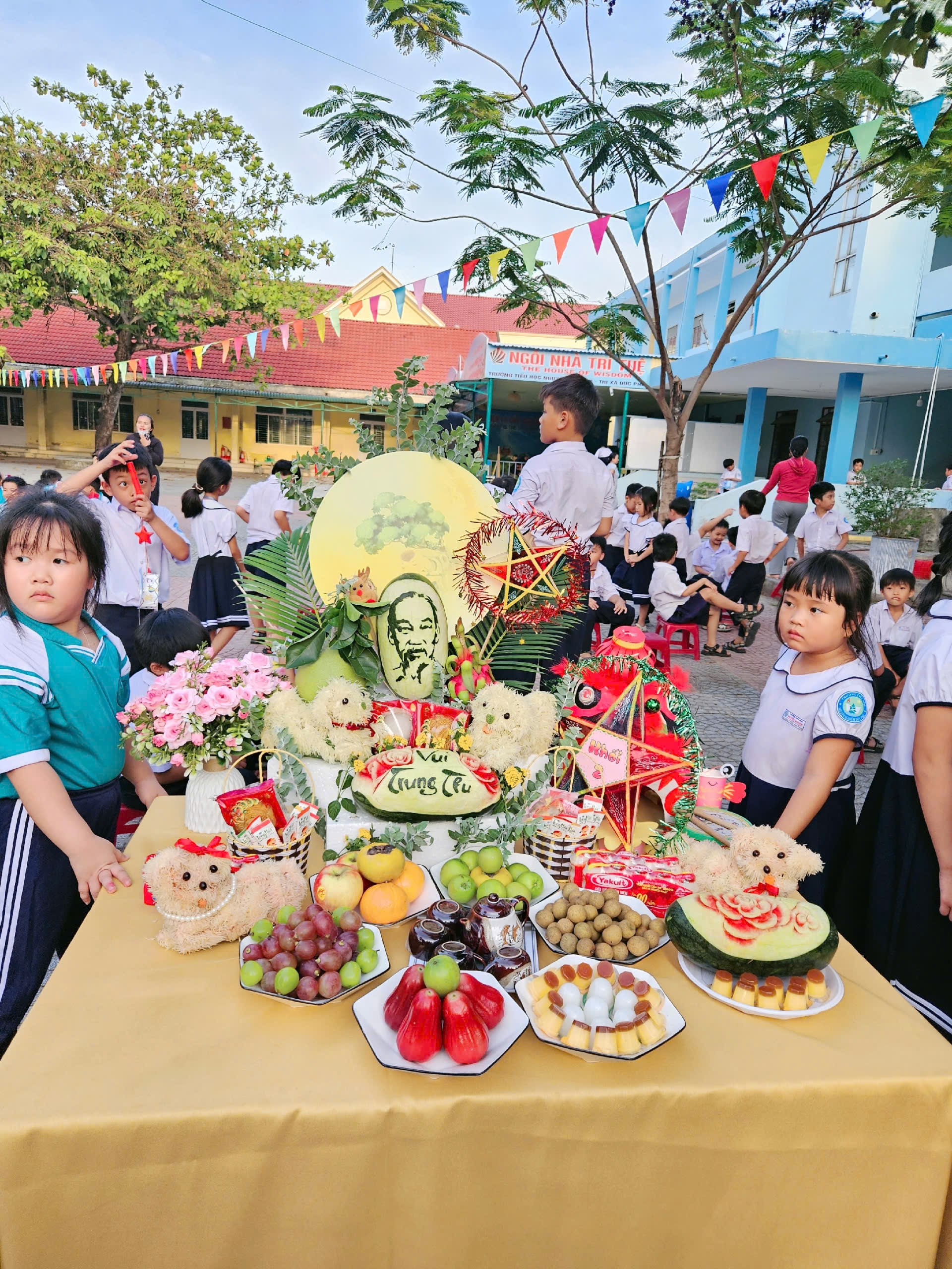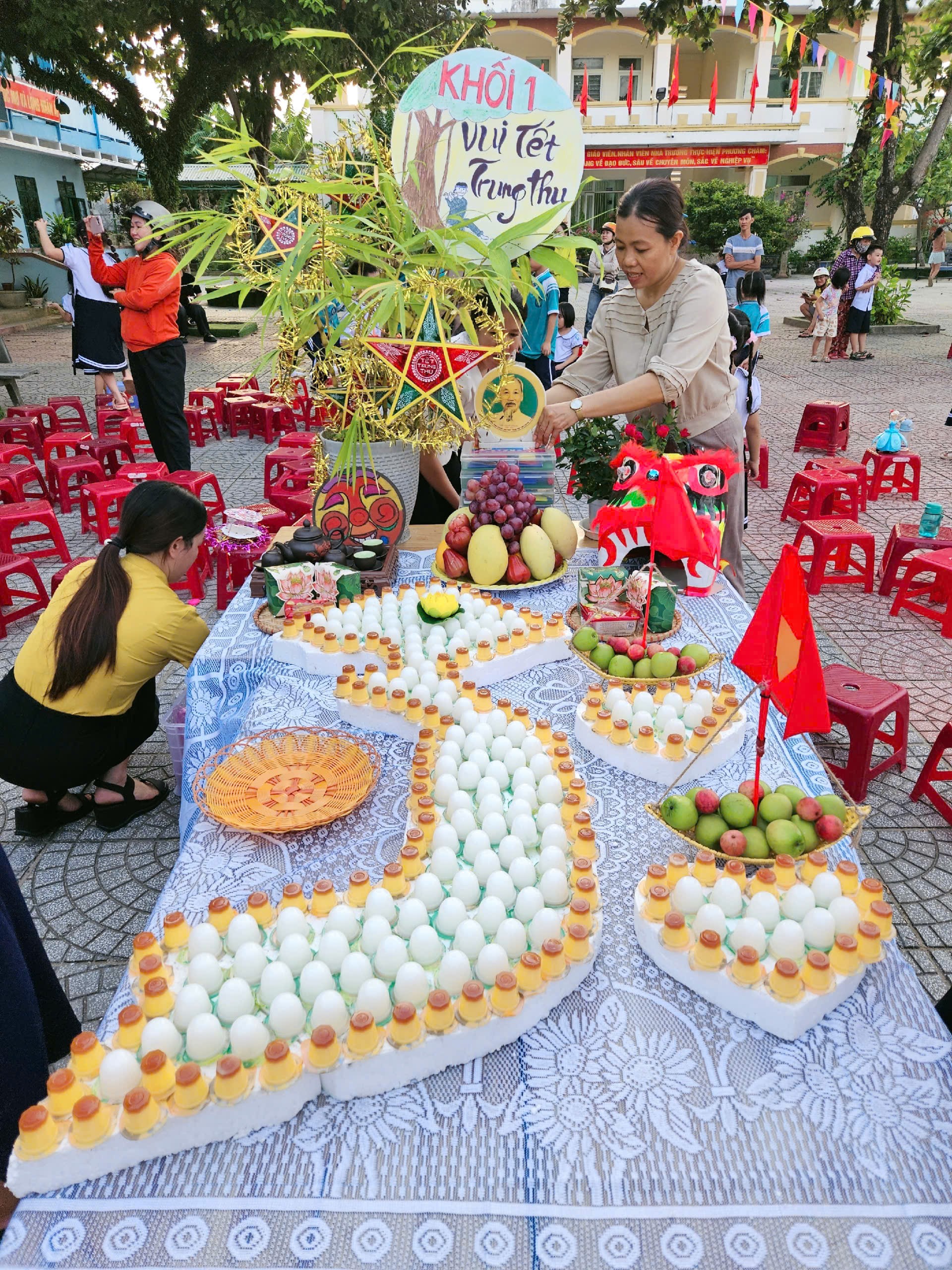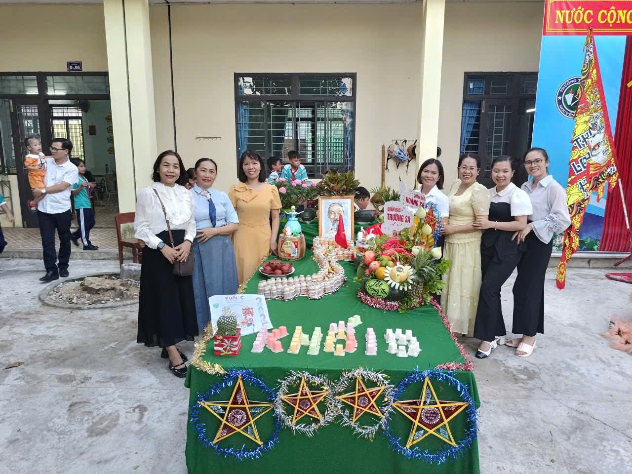 Để Tết Trung thu thực sự là ngày hội của các em, nhà trường đã tổ chức cho các lớp tham gia làm các mâm cỗ trung thu. Với sự giúp đỡ của các thầy cô giáo và các phụ huynh học sinh, từ các loại hoa quả khác nhau các em tạo ra được những con vật đáng yêu, ngộ nghĩnh với nhiều hình dáng phong phú, trang trí mâm cỗ trung thu đẹp mắt, thể hiện niềm vui và tính sáng tạo trong mỗi sản phẩm.